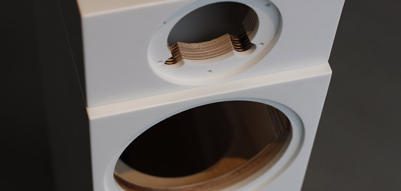 Die Werkstoffe für die Gehäuse sind nach langen Hörproben und Messungen mit mehreren Gehäusen aus unterschiedlichen Materialien und Materialkombinationen ausgesucht worden. Bei unseren Lautsprechern Monitor 1 und Modell 3 verwenden wir für das gesamte Gehäuse ein Sandwich aus einem acrylgebundenen Mineralwerkstoff (DuPont™ Corian®) und Birke Multiplex.